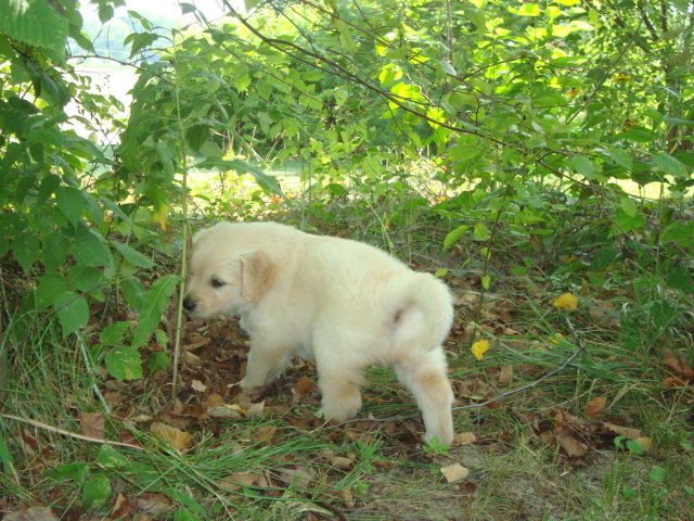 The pups are huge, weighing in at 13-14 lbs. Juliette will not close the milk bar. It is quite amusing out in the yard when Juliette will make a feeble effort to get away from the pups. Even as she is walking away, the pups still do an amazing job of catching lunch on the run. Just today, I introduced the pups to hard puppy kibble, and they had no problems making that adjustment. They are each eating 1 cup of kibble per day, and looking for more. As is typical of 7-week old pups, the pair is seeking lots of activity and interaction, with numerous short naps to recharge. As weather allows, the pups have been spending considerable time in the backyard, eagerly explore the entire yard which is quite large. Yesterday evening, the pups individually went on their first walkie on leash. Just a walk to the neighbor's house and back, but Mindy got to meet a boy on a bike which was a great experience for her. The pups are thoroughly enjoying interacting with all of their many visitors. As much fun as it is to have baby pups in the house, by 8 weeks of age, it is readily apparent that the pups are ready to go solo and get some quality one-on-one attention from people so that they can grow up to full potential.